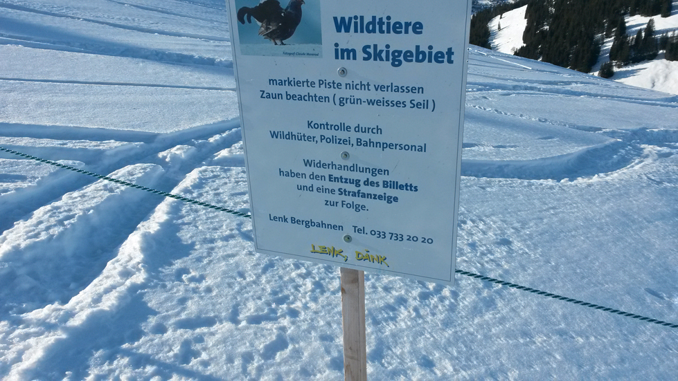 20.02.2014: Ski- und Snowboardsportler durchfahren trotz Verbotstafeln und Absperrvorrichtungen immer wieder Wildruhezonen in Skigebieten und beeinträchtigen so die Lebensräume von Alpenwildtieren – wie Pingwin Planet beobachtet hatte. Mit einer Aktion vor Ort machten Freiwillige der Umwelt- und Tierschutzorganisation heute im Skigebiet Adelboden-Lenk auf die Problematik aufmerksam. Sie bewachten Wald- und Wildruhezonen, die oft durchfahren werden.